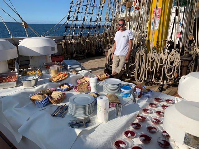 Tagesbericht 10.07.2020 Mittagsposition: Travemünde, Ostpreußenkai Das Wetter: Erst Regen, dann sonnig Leinen los! Liebe Alex-Fans, nach einer durchregneten Nacht begann der Tag mit dem allgemeinen Wecken um 7 Uhr. Zum Frühstück verwöhnte uns unser Smut Klaus mit frischen Brötchen und Rührei. Anschließend kam unsere Proviantlieferung. Alle fassten mit an, und…...