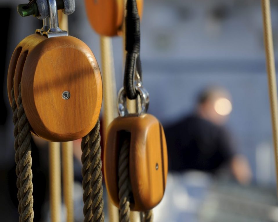 Zur Holzarbeit: Wir haben zur Zeit wieder eine Wandergesellin mit an Bord, die sich der Tischlerei verschrieben hat. Ergo: die Nagelbänke auf der Back werden geschliffen und geölt. Die übrigen haben den Service schon auf dem letzten Törn bekommen. Stamm und Freiwillige an das Schleifpapier und an die Pinsel! Halt stopp! Vorher noch die ganzen Tampen runter von den Bänken und mit Mülltüten abgedeckt. Sieht schon lustig aus, so ein „Tampenmüllberg“.
