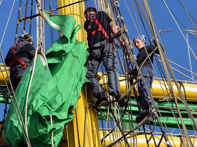Auf den Decks saßen immer wieder Wachmannschaften zum theoretischen Unterricht zusammen. Beispiel: Wie hat sich die Besegelung einer Bark entwickelt und wie heißen die Segel? Oder: Wie ist das laufende Gut, die Taue, organisiert? Aber Trainees, Leichtmatrosen-Anwärter und Stammcrew-Mitglieder wurden auch in getrennten Gruppen je nach ihrem Vorwissen unterrichtet. Dazu kam eine G-Alarm-Übung (Generalalarm), an dem die komplette Crew teilnahm und ein Notruder-Manöver für die Stammcrew. Bootsmann „Wanze“ suchte und fand fleißige Hände, um Nagelbänke und andere Holzteile zu schleifen und frisch zu streichen. Maschinistin Katrin und Elektriker Rainer boten Führungen durch die technischen Anlagen des Schiffes an. Der Rundgang begann am Bugstrahlruder im Vorschiff, ging über die Klima- und Kühlanlage, die Antriebsmaschinen und die elektrischen/elektronischen Steuerungsanlagen bis zum hydraulisch unterstützen Ruder im Heck. Seeleute, die eine Bark noch als Arbeitsschiff kannten, würden sich in unserem Schiffsbauch wohl wie auf einer Raumstation vorkommen. Der heutige Trainee fährt nach dieser Besichtigung umso beruhigter weiter. Die teilweise mehrfache Redundanz macht gelassen!