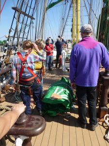 Kurz vor Mittag riss beim Brassen die Voruntermars am Backbord-Hals ein. Die 8-12 Wache bereitete also mit Unterstützung des Bootmanns und einigen Freiwächtern das Ersatzsegel vor. Im Anschluss wurde das beschädigte Segel abgeschlagen und nach dem Mittagessen frisch gestärkt das bereit gelegte Ersatzsegel angeschlagen. Ein lehrreiches Manöver und neue Arbeit für den Segelmacher, wenn wir in Kiel das gerissene Segel zur Reparatur geben.
